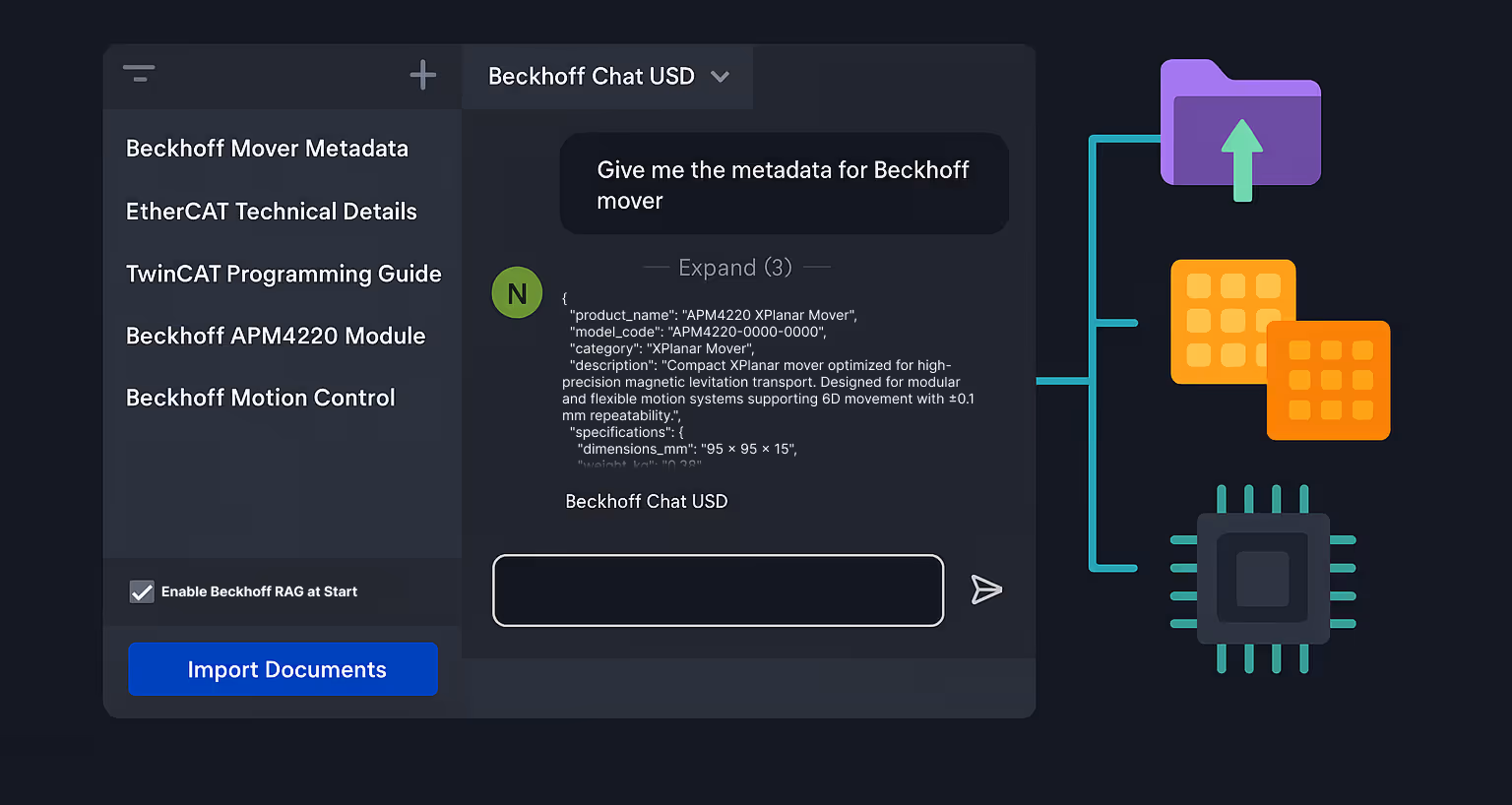The solution was the Drag-and-Drop RAG Import Widget, built directly into the Chat USD interface. With it, engineers can update Beckhoff documentation inside Omniverse in under a minute.